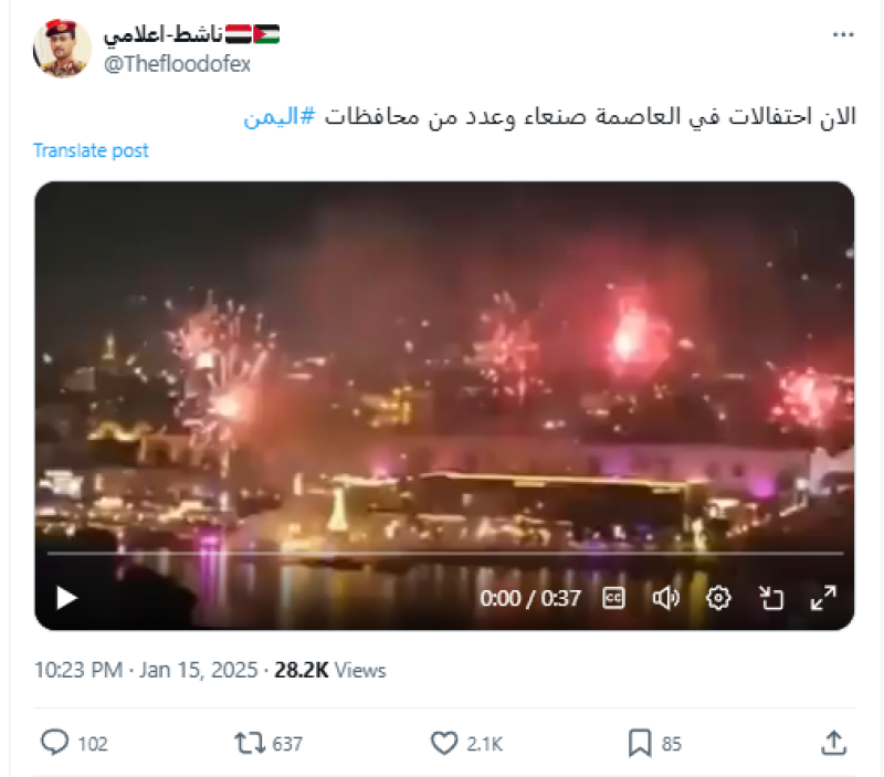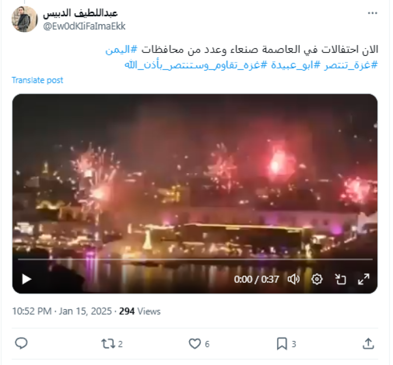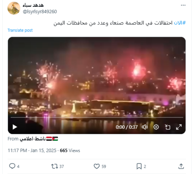 نشرت حسابات على منصة إكس مقطع فيديو ادَّعت أنه يوثق احتفالات في صنعاء وعدد من المحافظات اليمنية بمناسبة الإعلان عن اتفاق وقف إطلاق النار في غزة، لكن الادعاء ليس صحيحا.