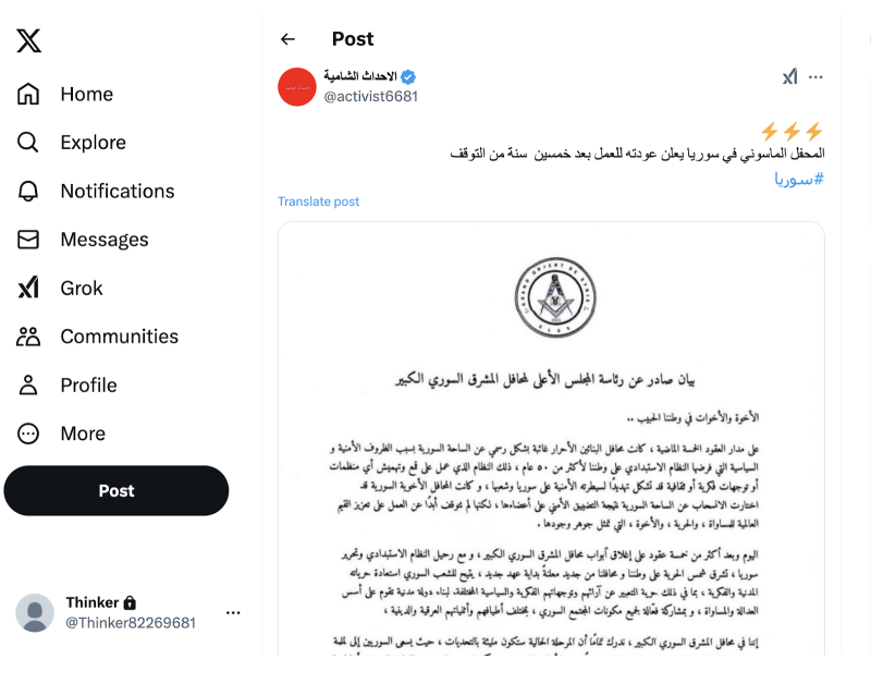 نشرت حسابات وصفحات على منصة إكس صورة ادعت أنها بيان بعودة نشاط المحفل الماسوني السوري إلى دمشق بعد انقطاع لما يقرب من خمسة عقود، لكن الادعاء ليس صحيحا.