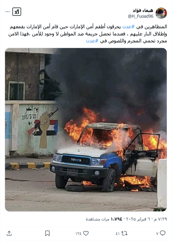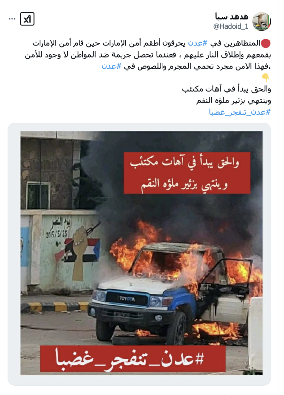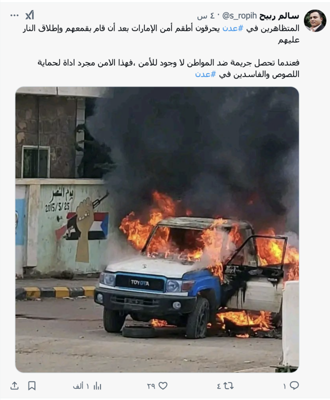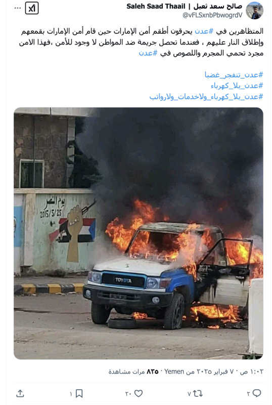 نشرت حسابات وصفحات على منصة أكس صورة مدعين انها لحرق متظاهرين في العاصمة اليمنية المؤقتة عدن مؤخرا مركبة عسكرية، لكن الادعاء ليس صحيحا