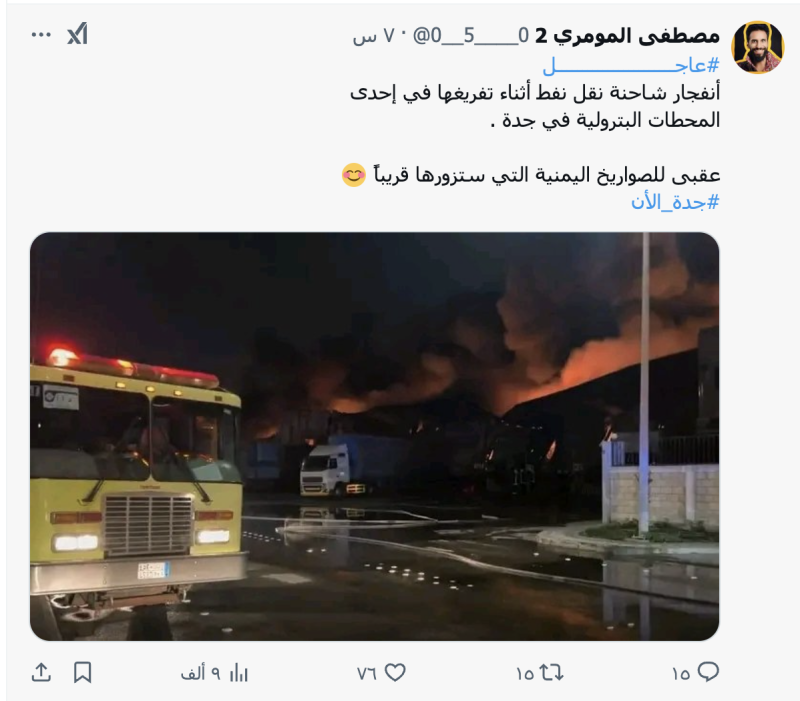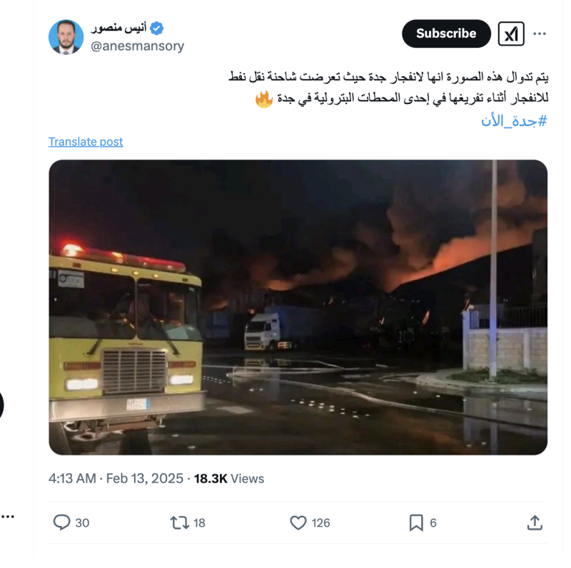 نشرت حسابات على منصة أكس صورة مدعين انها الانفجار شاحنة نقل نفط أثناء تفريغها في إحدى المحطات البترولية في مدينة جدة مؤخرا لكن الادعاء ليس صحيحا