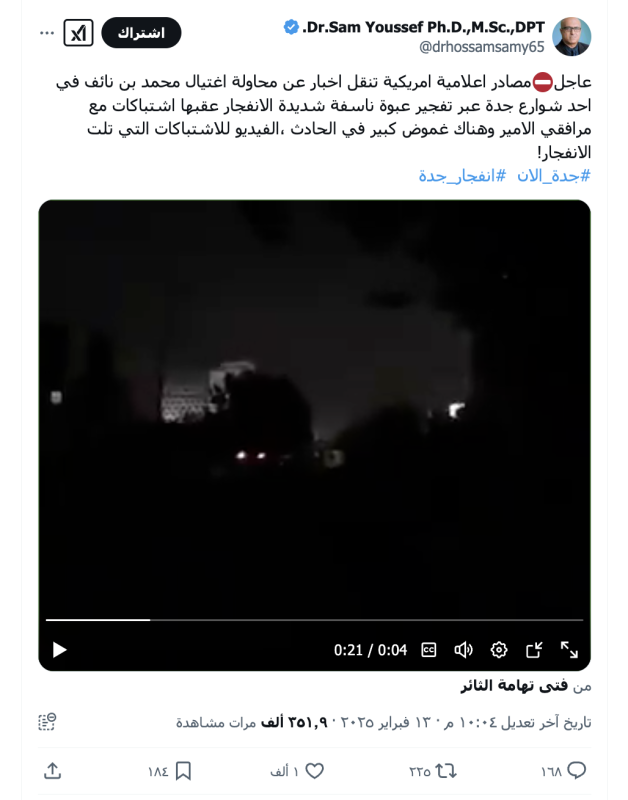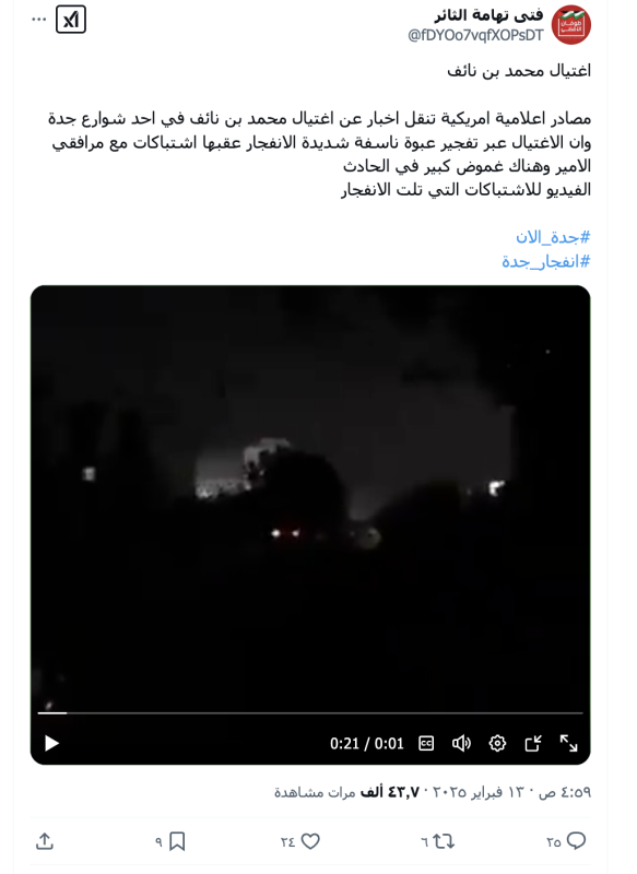 نشرت حسابات على منصات التواصل الاجتماعي (مقطع فيديو) زعمت أنه لمحاولة اغتيال الأمير السعودي وولي العهد السابق محمد بن نايف في وسط مدينة جدة.