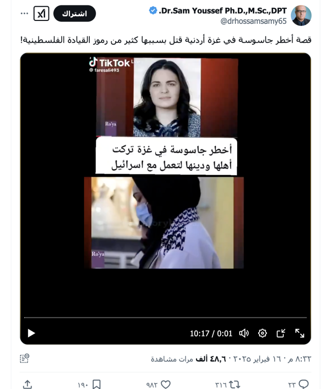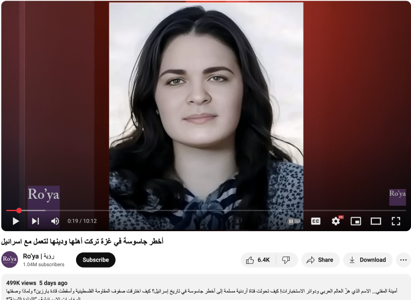 نشرت قناة رؤية على يوتيوب، فلما وثائقيا أدعت فيه أن جاسوسة إسرائيلية من أصل أردني هي أخطر جاسوسة إسرائيلية في غزة ، ربما تكون هي من كشفت مكان السنوار، وأعادت حسابات كثيرة على وسائل التواصل نشر الفيديو، لكن الادعاء ليس صحيحا