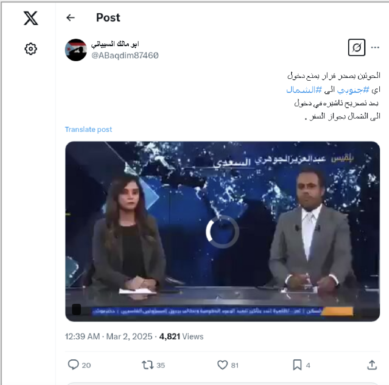 نشرت حسابات وصفحات على منصات التواصل الاجتماعي مقطع فيديو ادعت أنه لقرار جديد اصدرته جماعة الجماعة الحوثيين حديثا، يقضي بمنع دخول أي مواطن جنوبي إلى الشمال إلا بجواز سفر.