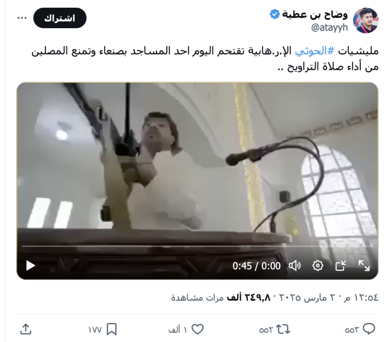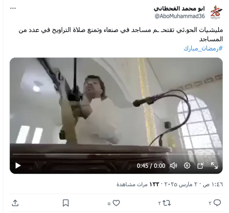 تداولت حسابات على منصة التواصل الاجتماعي إكس مقطع فيديو، مدعية أنه يظهراقتحام جماعة الحوثيين اليوم الأحد الموافق ٢ رمضان مسجد في العاصمة صنعاء ومنع صلاة التراويح فيه بالقوة