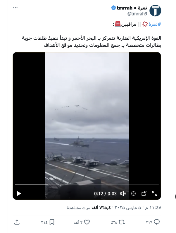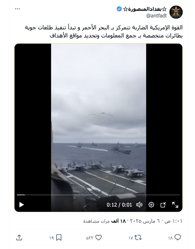 نشرت حسابات وصفحات على منصة إكس مقطع ادعت أنه لإنتشار القوة الأمريكية في البحر الأحمر والبدء بتنفيذ طلعات بطائرات متخصصة بـ جمع المعلومات وتحديد مواقع الأهداف