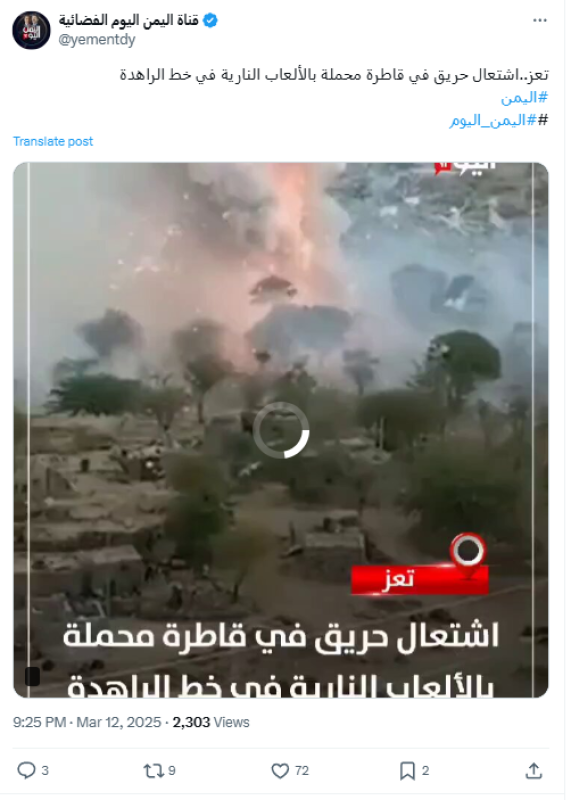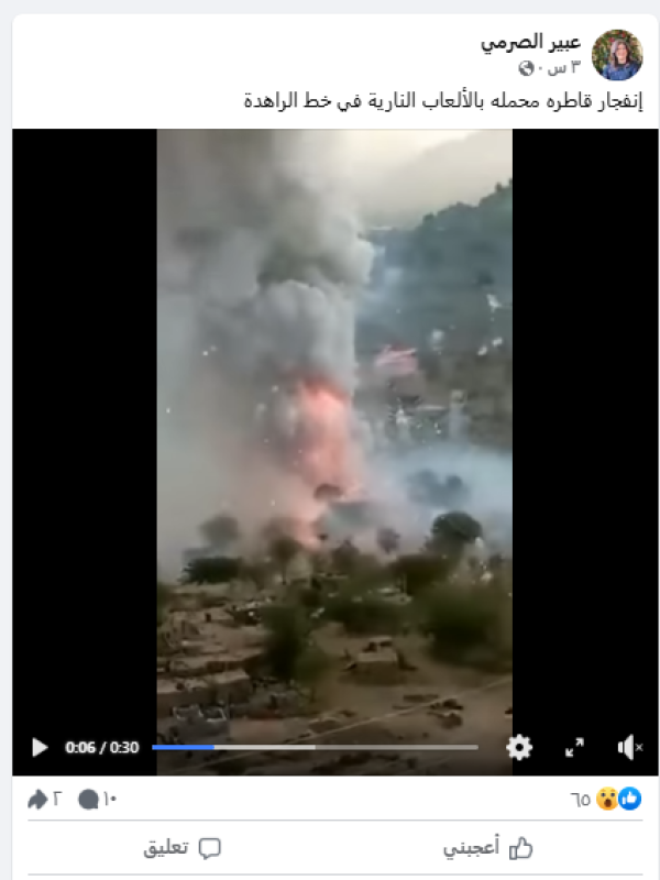 نشرت حسابات وصفحات على مواقع التواصل الاجتماعي مقطع فيديو ادعت أنه يوثق اشتعال حريق في قاطرة محملة بالألعاب النارية في خط الراهدة الرابط بين محافظتي تعز ولحج.