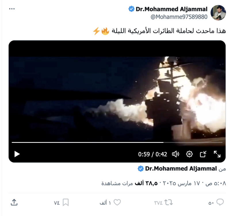نشرت حسابات على منصة اكس مقطع فيديو، مدعية أنه يوثق هجوما للحوثيين استهدف حاملة الطائرات الأمريكية في البحر الأحمر، مؤخرا وجاء نشر الادعاء بالتزامن مع إعلان جماعة الحوثي فجر اليوم الاثنين، استهداف حاملة الطائرات الأمريكية "يو أس أس هاري ترومان" للمرة الثانية خلال 24 ساعة، ردًا على العملية العسكرية التي أعلنها الرئيس الأمريكي دونالد ترامب يوم السبت.