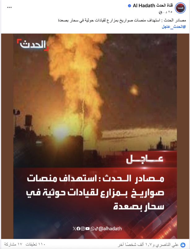 نشرت حسابات وصفحات على منصة إكس صورة ادعت أنها تظهر استهداف منصات صواريخ بمزارع قيادات حوثية في سحار بصعدة