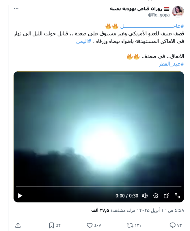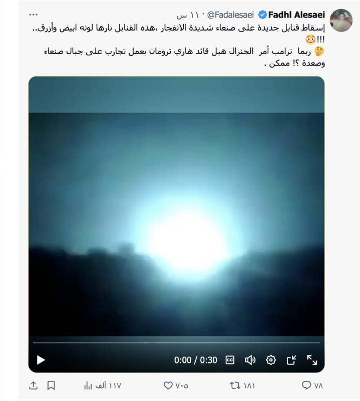 نشرت حسابات وصفحات على منصات التواصل الاجتماعي مقطعا ادعت أنه لانفجارات في مخازن أسلحة عقب غارات شنتها طائرات أمريكية على مواقع لجماعة الحـ.ـوثيين في صنعاء، فيما ادعى آخرون أنها من صعدة.