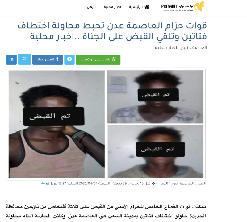 تداولت مواقع إخبارية وحسابات على منصات التواصل الاجتماعي خبرا أدعت فيه أن قوات الحزام الأمني بالعاصمة المؤقتة عدن احبطت محاولة اختطاف فتاتين، وقبضت على ثلاثة نازحين من محافظة الحديدة حاولوا تنفيذ عملية الاختطاف.