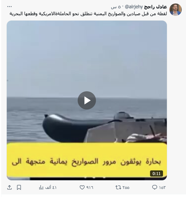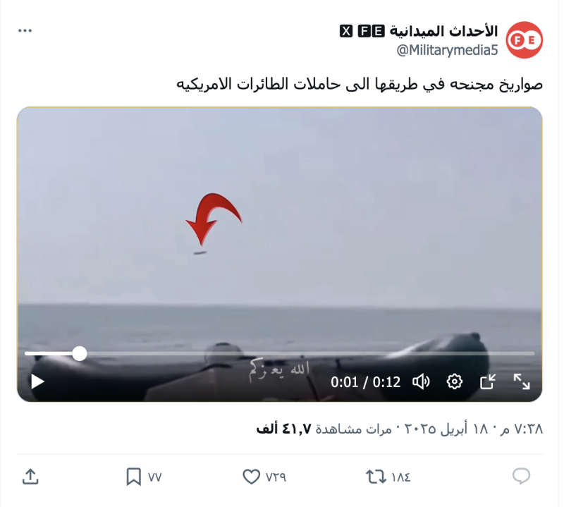 نشرت حسابات وصفحات على منصة التواصل الاجتماعي إكس مقطع فيديو مدعية أنه بظهر صواريخ مجنحة يمنية في طريقها إلى حاملات الطائرات الأمريكية.