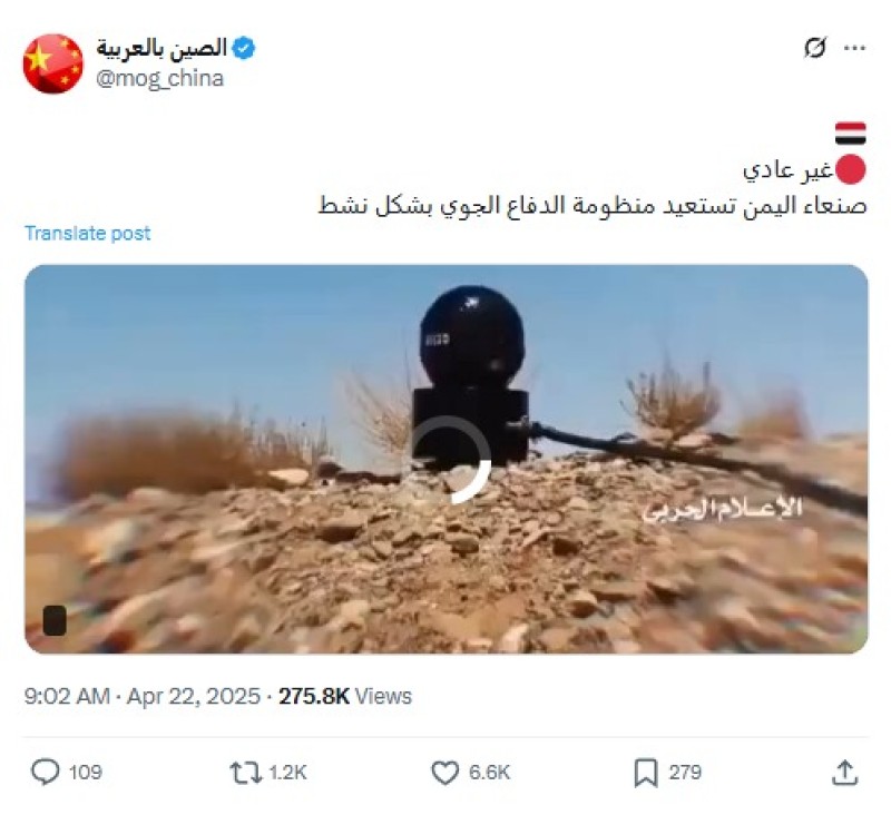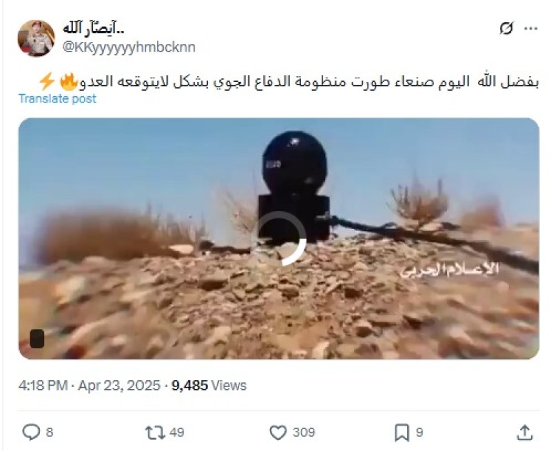 تداولت حسابات وصفحات على منصة إكس، خلال يومي 22 و23 أبريل الجاري، مقطع فيديو ادعت أنه يوثق ما وصفته بـ"استعادة صنعاء لمنظومة الدفاع الجوي.