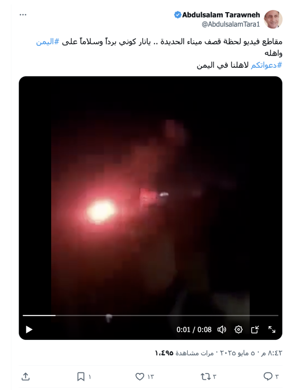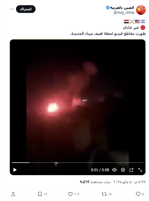 نشرت حسابات وصفحات على منصة إكس مقطع فيديو زاعمة أنه يوثق اللحظات الأولى للقصف الإسرائيلي على ميناء الحديدة غربي اليمن مساء اليوم