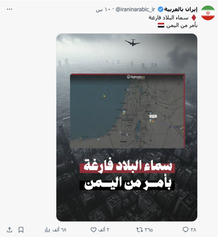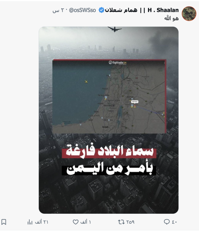 نشرت حسابات وصفحات على منصة إكس وفيس بوك صورة لحركة الطيران تظهر خلو سماء إسرائيل من الطائرات وعلقت عليها " سماء البلاد فارغة بأمر من اليمن