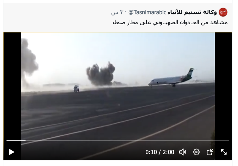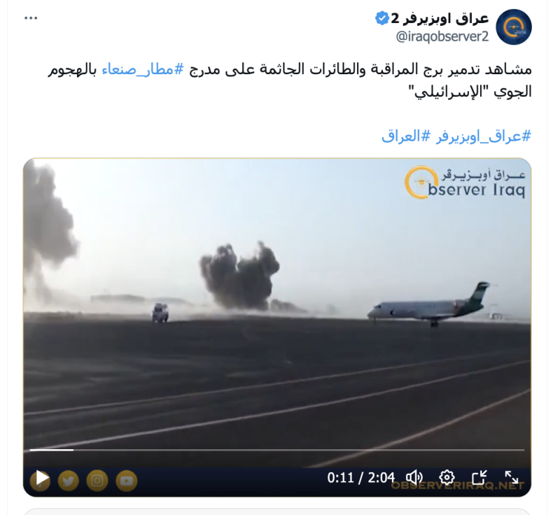 نشرت حسابات على منصة إكس مقطع فيديو ادعت أنه يوثق قصف الطيران الاسرائيلي لمطار صنعاء الدولي اليوم الثلاثاء 6 مايو/أيار 2025.