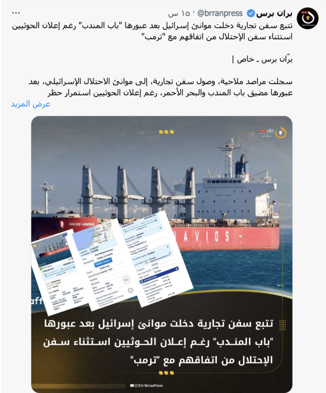 تداولت حسابات وصفحات على منصات التواصل الاجتماعي والمواقع الإلكترونية خبرًا يزعم أن مراصد ملاحية سجلت دخول سفن تجارية إلى موانئ الاحتلال الإسرائيلي بعد عبورها مضيق باب المندب والبحر الأحمر.