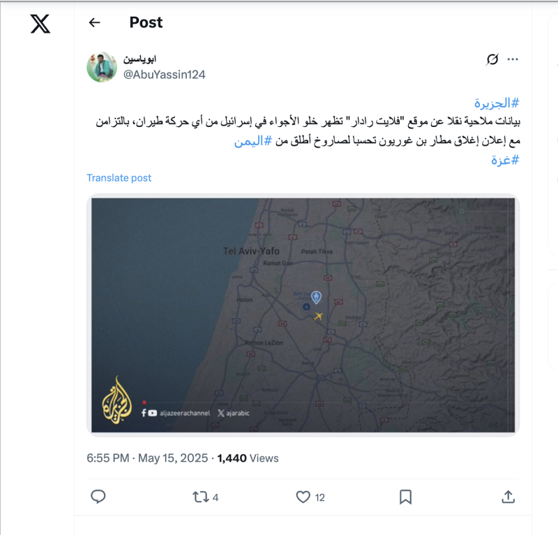 نشرت قناة الجزيرة القطرية على منصاتها في فيسبوك وإكس (تويتر سابقًا) صورة مأخوذة من أداة تعقّب الطيران "فلايت رادار" تُظهر أجواء إسرائيل خالية من الطيران بعد إطلاق صاروخ من اليمن، ونقلت العديد من الحسابات ما نشرته الجزيرة.