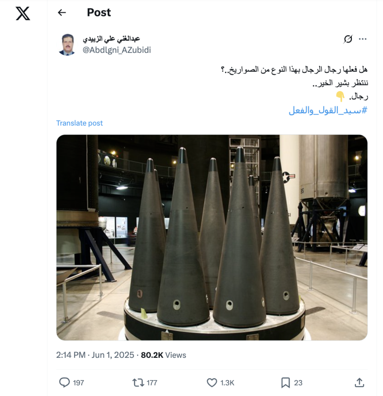 تداولت حسابات وصفحات على منصة إكس (تويتر سابقًا) صورة زُعم أنها لصواريخ من تصنيع جماعة الحوثيين في اليمن، قيل إنها ستُستخدم لقصف إسرائيل