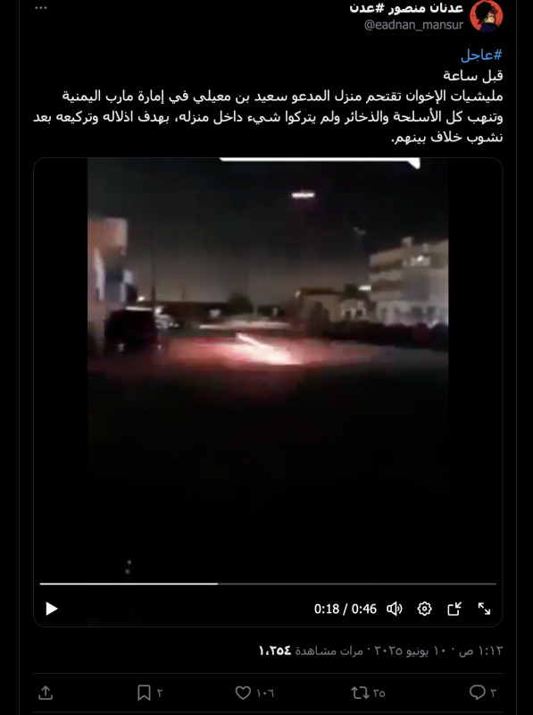 نشرت حسابات وصفحات على منصة التواصل الاجتماعي إكس تويتر سابقا مقطع فيديو ادعت أنه لاقتحام منزل منزل سعيد بن معيلي في محافظة مأرب ونهب كل الأسلحة والذخائر.