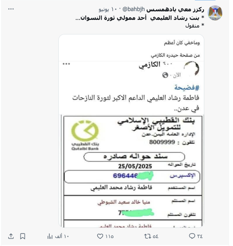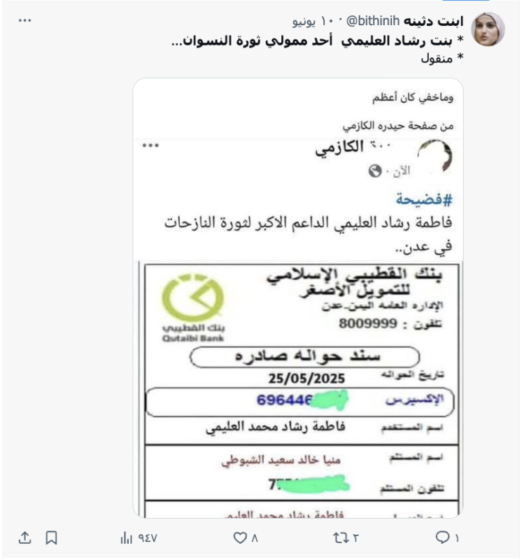 ويعزز زيف الادعاء ما ورد في تعليقات المتابعين، حيث أشار حساب باسم " ابو سلمان مهدي باشيع" إلى أن أحد أرقام الهواتف الظاهرة في الصورة يعود إلى شخص يدعى مهدي المحفدي، ليرد عليه الأخير ساخرًا بالقول: "أتعبت نفسك في البحث عن اسم صاحب الرقم على أساس أن الخبر صحيح، وأن الرقم المخفي يعود لمنيا خالد"، في إشارة واضحة إلى عدم صدقية الادعاء وسخريته منه.