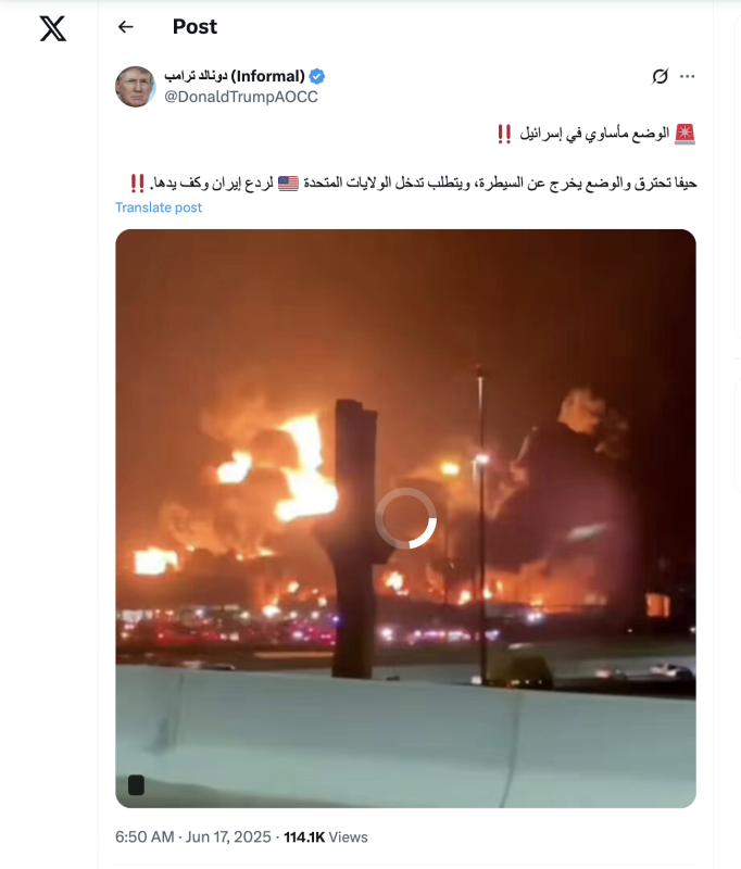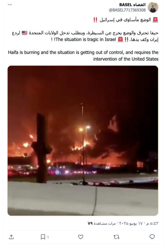 تداولت حسابات وصفحات على منصة "إكس" تويتر سابقا مقطع فيديو تزعم أنه يُظهر اندلاع حرائق في مدينة حيفا الإسرائيلية، مع الإشارة إلى أن الوضع خرج عن السيطرة ويتطلب تدخلاً من الولايات المتحدة لردع إيران.