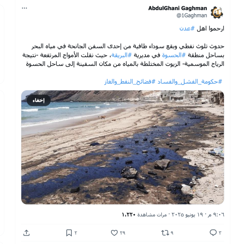 نشرت حسابات وصفحات على منصتي إكس وفيسبوك صورة ادعت أنها لتلوث نفطي حديث على سواحل منطقة الحسوة مديرية البريقة محافظة عدن.