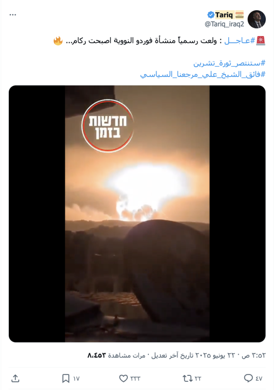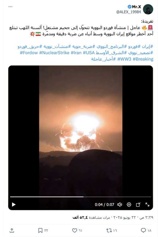 نشرت حسابات وصفحات على منصات التواصل الاجتماعي مقطع فيديو تزعم فيه أنه يوثق قصفاً أمريكياً استهدف منشأة "فوردو" النووية في إيران فجر الأحد، 22 يونيو 2025.