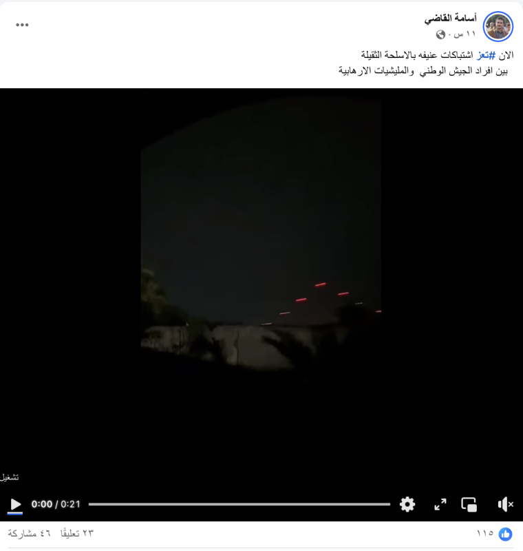 نشر ناشطون على منصتي "فيسبوك" و"إكس" (تويتر سابقا) مقطع فيديو يظهر مواجهات مسلحة، مدّعين أنه لإشتباكات أندلعت الليلة الماضية في تعز بين القوات الحكومية ومسلحي جماعة الحوثيين.