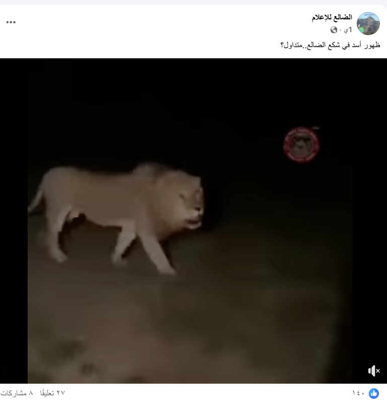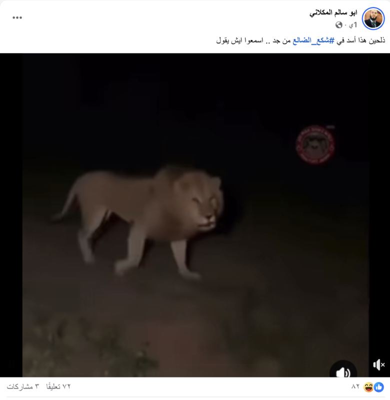 تداولت حسابات وصفحات على موقع التواصل الاجتماعي، "فيسبوك"، مقطع فيديو,مدعية أنه يوثق ظهور أسد في منطقة شكع الخربة شرق محافظة الضالع، وسط تحذيرات أطلقها ناشرو الفيديو للسكان في المنطقة.