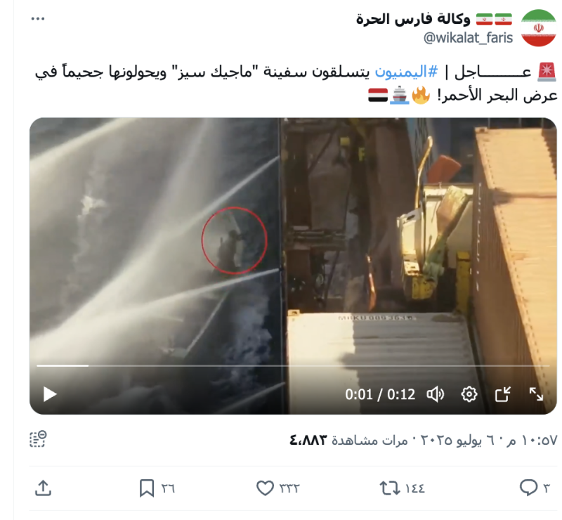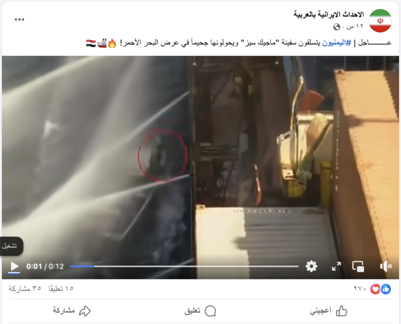 تداول حسابات وصفحات على منصتي فيسبوك واكس (تويتر سابقا) مقطع فيديو ادعت انه ليمنيين يتسلقون سفينة "ماجيك سيز" في البحر الأحمر.