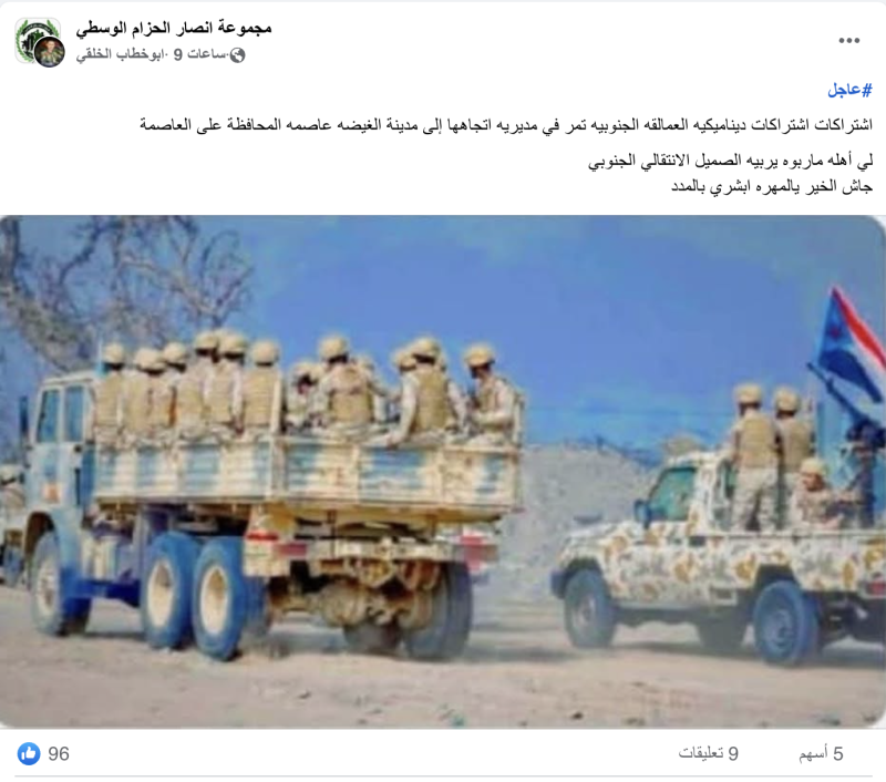 نشرت حسابات وصفحات على منصات التواصل الاجتماعي إكس وفيس بوك صورة مدعية أنها لتعزيزات عسكرية من قوات العمالقة تعبر مدينة سيحوت متجهة إلى عاصمة محافظة المهرة " الغيضة " مؤخرا