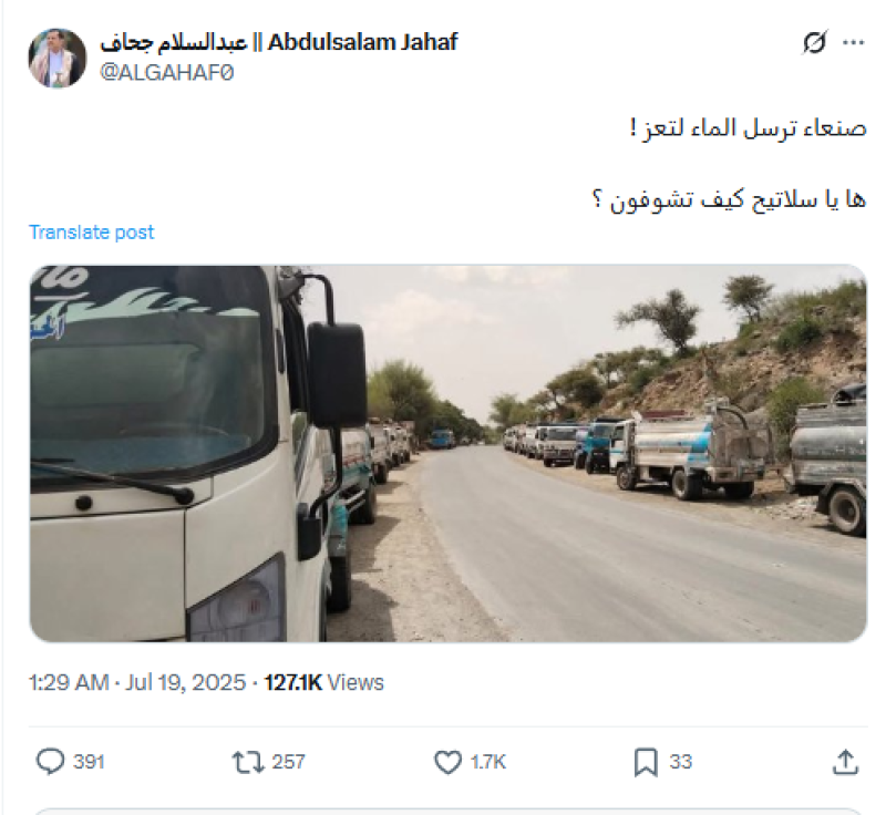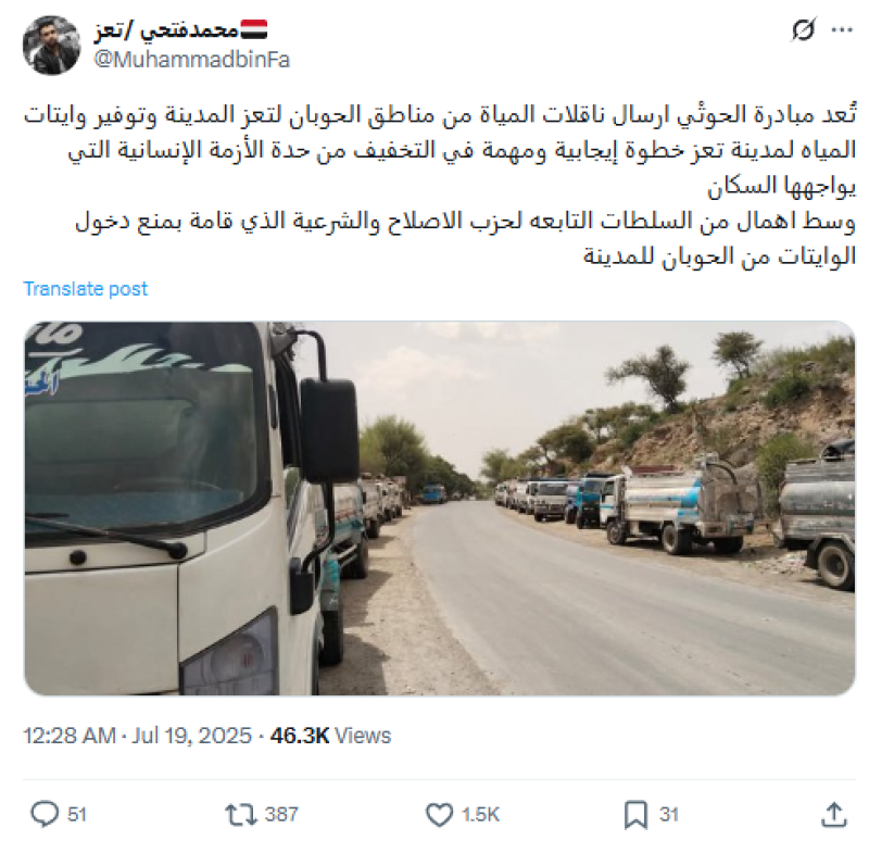 تداولت مواقع إلكترونية وحسابات على منصة "إكس" في 19 يوليو/تموز 2025، صورة تُظهر عدداً من صهاريج المياه، زاعمة أنها تعود لناقلات أرسلتها جماعة الحوثي من الحوبان إلى مركز مدينة تعز الخاضع لسيطرة الحكومة المعترف بها دوليًا.
