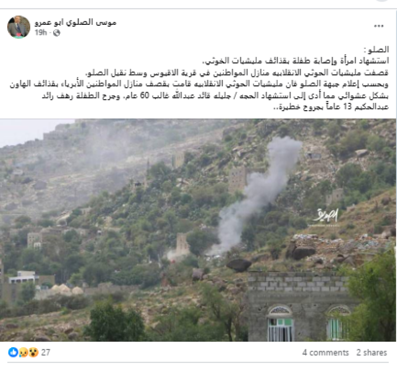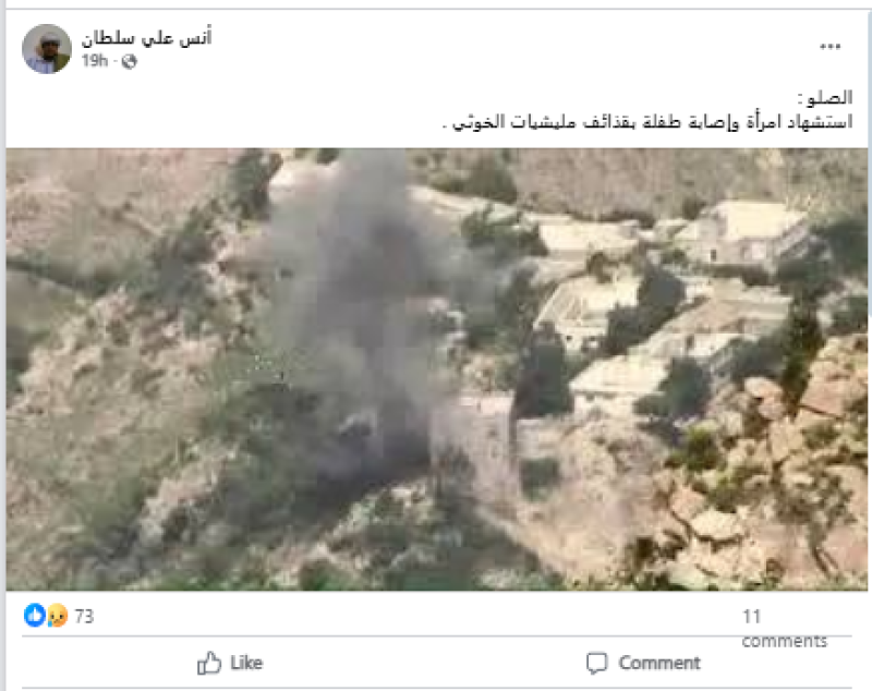 جاء نشر الادعاء بعد ساعات من إعلان القوات الحكومية مقتل امرأة وإصابة طفلة في قصف استهدف قرية الأقيوس، وسط نقيل الصلو، جنوب تعز.