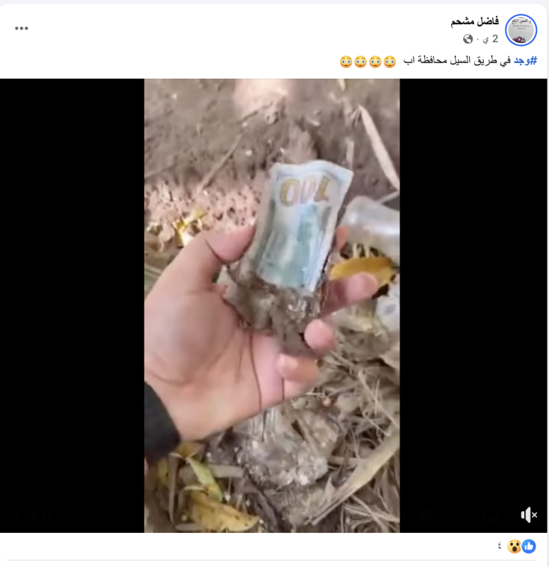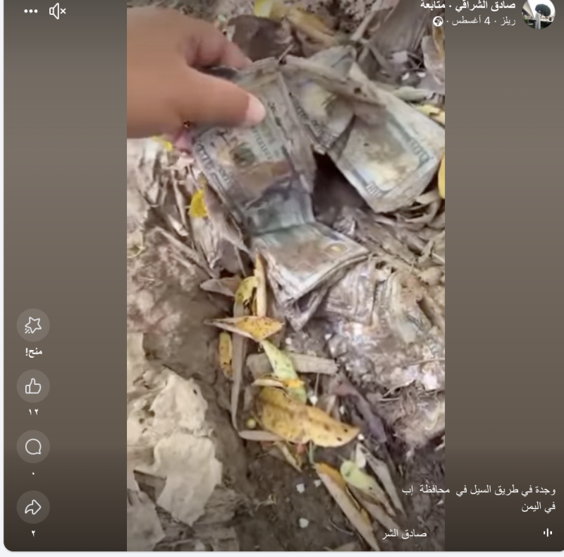 نَشرت حسابات على منصّتَي فيسبوك وإكس مقطع فيديو زعمت أنه يُوثّق العثور على مبالغ مالية من الدولارات في أحد مجاري السيول بمحافظة إب، وسط اليمن.