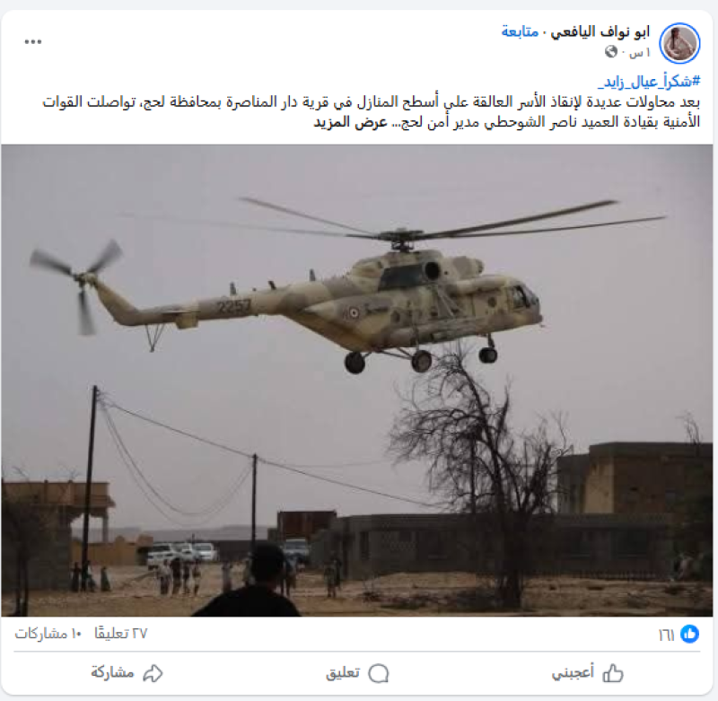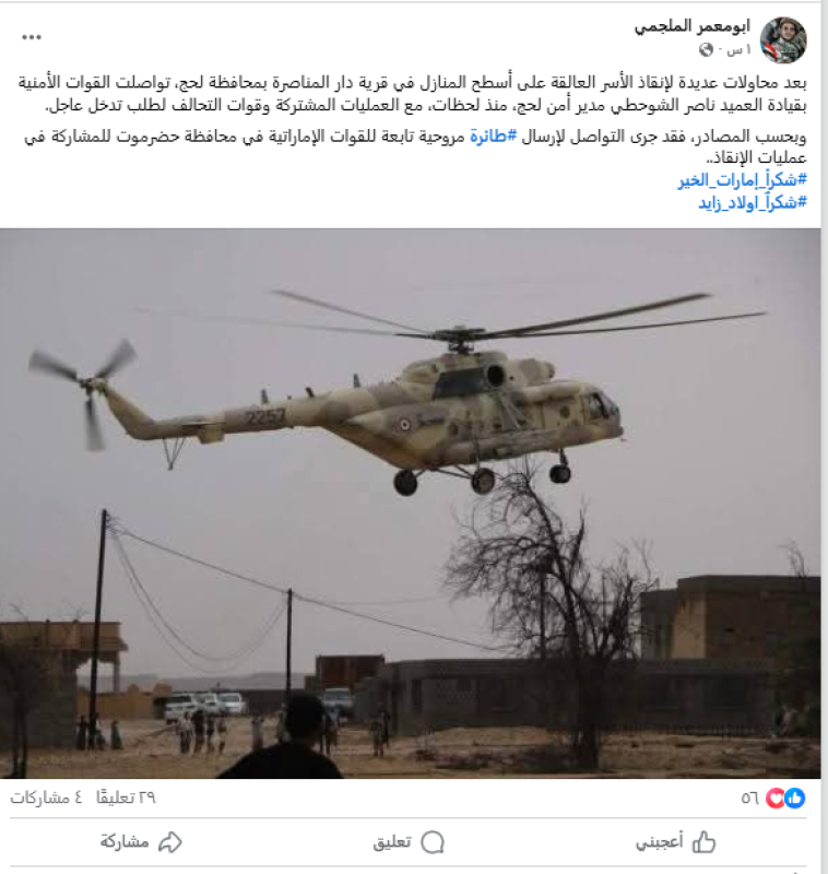 تحقق يوب يوب من الادعاء، وتبين أنه مضلل، إذ تعود الصورة إلى أكتوبر 2018، وتوثق عمليات إنقاذ الأسر العالقة في محافظة المهرة عبر مروحيات تابعة للحكومة الشرعية والقوات السعودية، خلال إعصار "لبان".