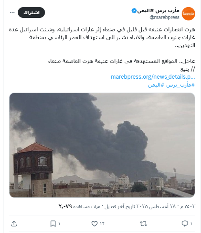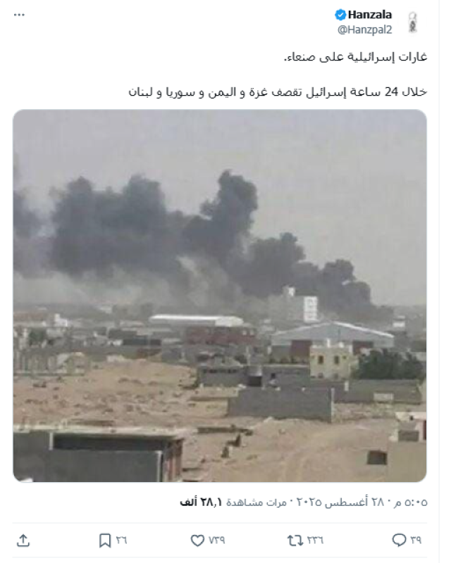 تداولت حسابات على منصة إكس مساء الخميس (28 أغسطس 2025) صورتين قيل إنها توثق غارات جوية شنها الجيش الإسرائيلي على العاصمة صنعاء.