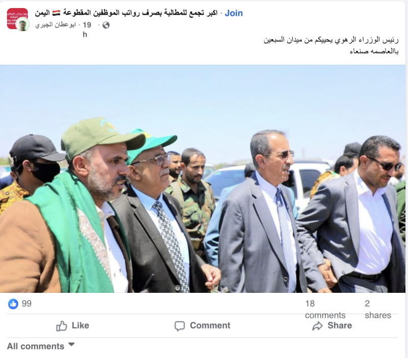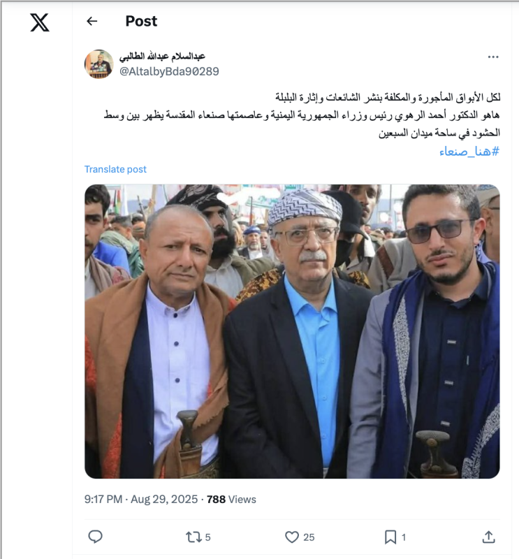 نشرت حسابات وصفحات على منصتي فيسبوك وإكس صورتين زعمت أنهما تُظهران رئيس مجلس الوزراء لدى جماعة الحوثيين أحمد غالب الرهوي في ميدان السبعين بصنعاء.