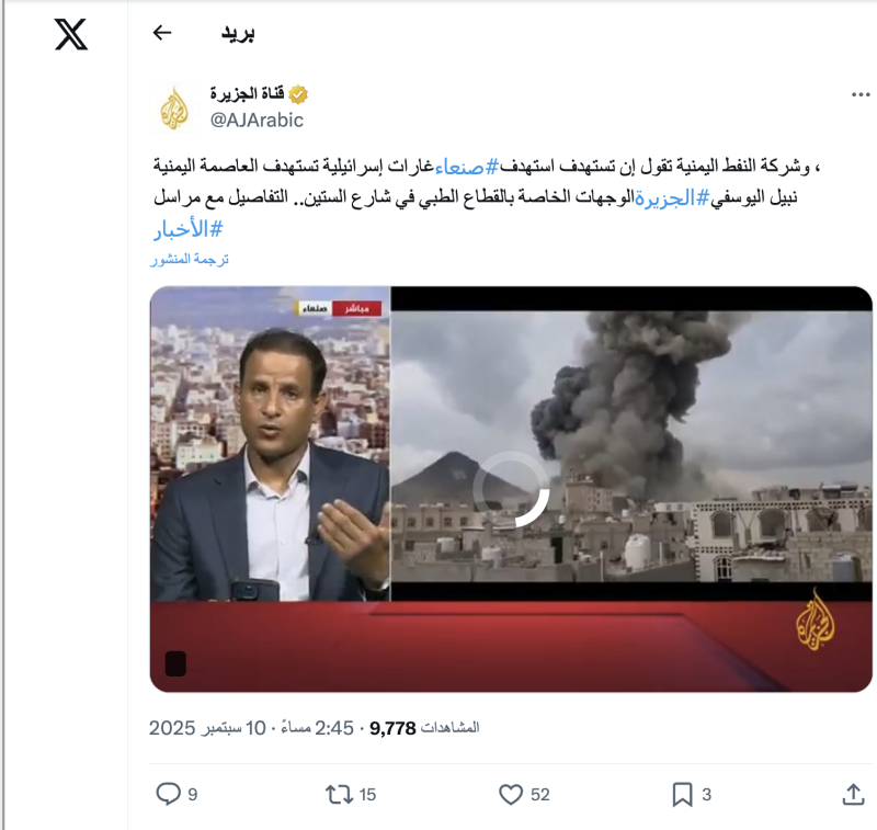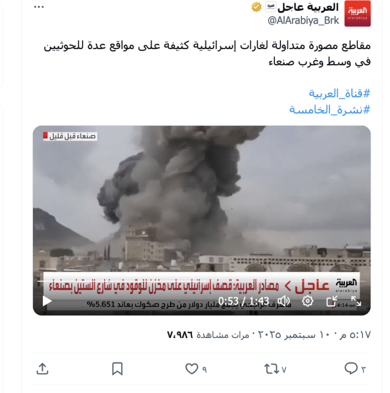 نشرت قنوات وحسابات على منصة إكس وفيس بوك مقطع ادعت أنه لبثت مباشر للقصف الإسرائيلي على صنعاء مساء اليوم 10 سبتمبر 2025