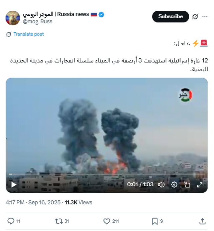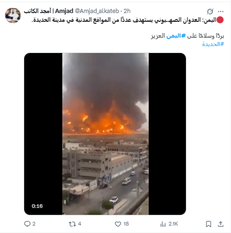 تداولت حسابات على منصة "إكس" مقطعي فيديو زُعم أنهما يوثّقان قصفًا إسرائيليًا حديثًا استهدف ميناء الحديدة مساء الثلاثاء 16 سبتمبر 2025.