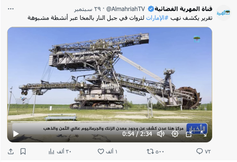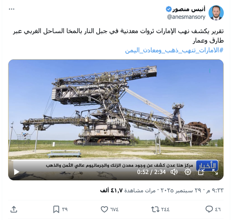 نشرت موقع وحسابات وصفحات على منصة إكس الادعاء أن معادن بينها الذهب والنحاس والزنك،والجرمانيوم في مديرية المخا غرب محافظة تعز تتعرض للنهب.