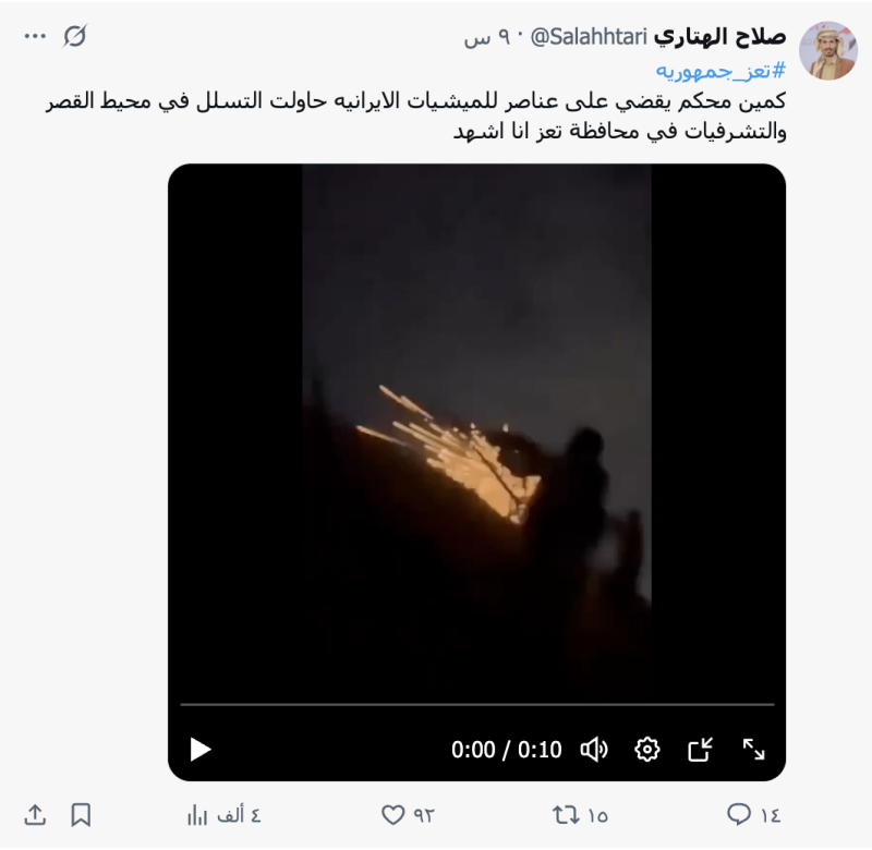 نشرت حسابات على منصتي فيسبوك وأكس مقطع فيديو أدعت أنه لاشتباكات بين قوة الجيش و مسلحي جماعة الحوثيين فجر اليوم الإثنين 6 أكتوبر 2025