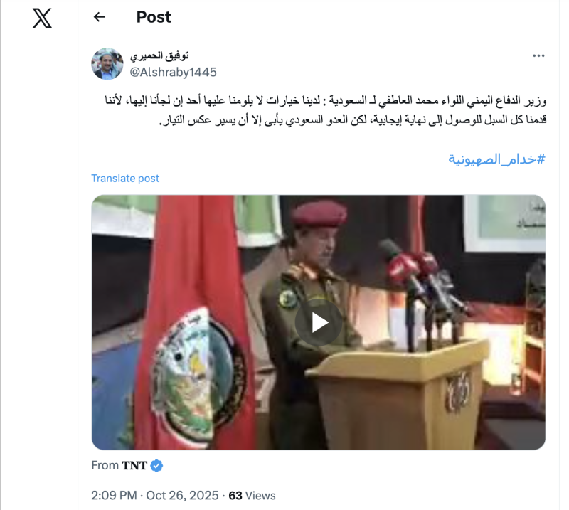 نشرت حسابات وصفحات على منصات التواصل الاجتماعي مقطع فيديو لوزير الدفاع في جماعة الحوثيين مدعية أنه لتحذير جديد وجهة للمملكة العربية السعودية.