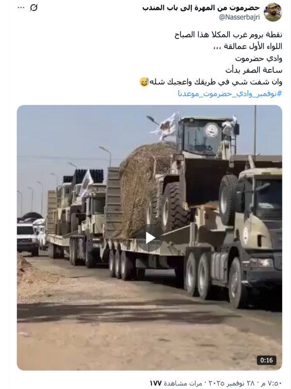 نشرت حسابات على منصة إكس مقطع فيديو ادعت أنه لدخول قوات اللواء الأول عمالقة إلى المكلا بسلاحة الثقيل والنوعي من نقطة بروم