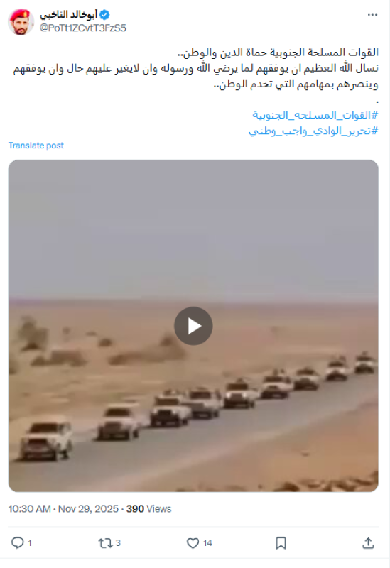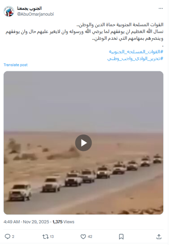 نشرت حسابات على منصة إكس (تويتر سابقًا)، مقطع فيديو ادعت أنه يظهر قوات عسكرية تابعة للمجلس الانتقالي الجنوبي متجهة نحو محافظة حضرموت.