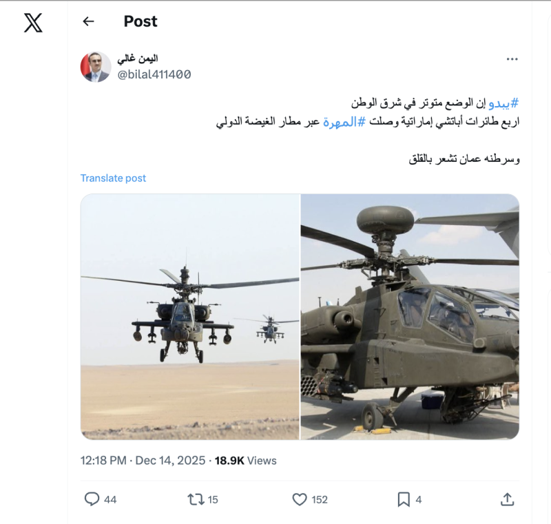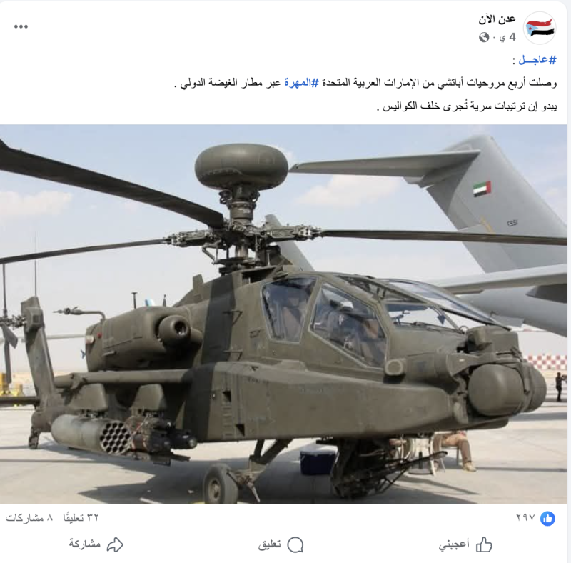 نشرت حسابات وصفحات على منصتي التواصل الاجتماعي فيسبوك وأكس صورتان أدعت انها لطائرات أباتشي إماراتية وصلت مطار الغيضة الدولي في في المهرة.