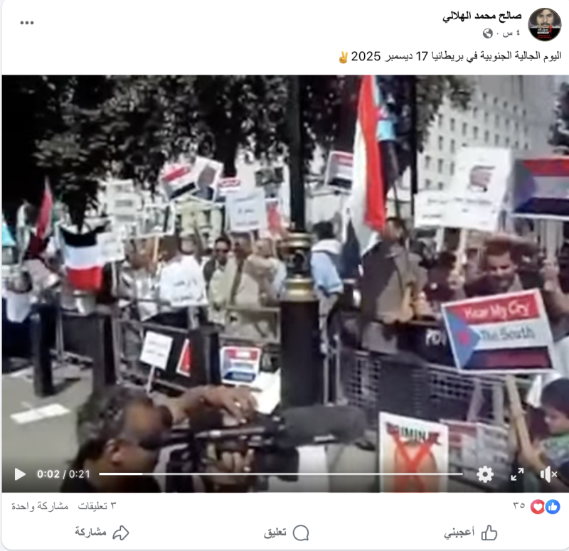 نشرت حسابات على منصة التواصل الاجتماعي فيسبوك مقطع فيديو، مدعيةً أنه يُظهر مظاهرة حديثة في لندن للجالية الجنوبية في بريطانيا تؤيد إعلان دولة الجنوب العربي.