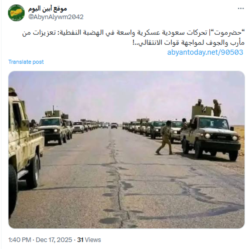 تداولت حسابات مواقع إخبارية على منصة «إكس» صورة زعمت أنها توثق تحركات عسكرية سعودية قادمة من محافظتي مأرب والجوف، في إطار استعداد لمواجهة قوات المجلس الانتقالي الجنوبي في حضرموت.