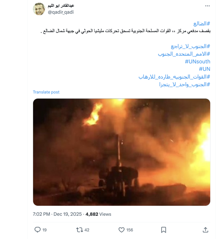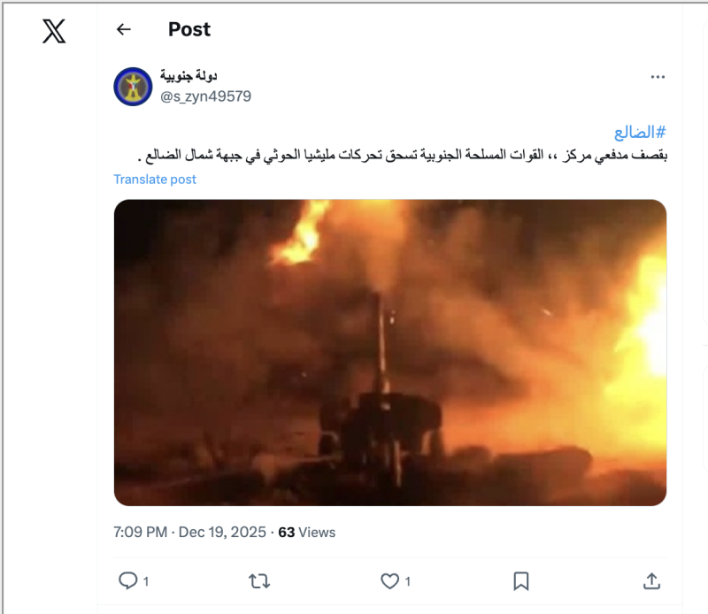 نشرت حسابات وصفحات على منصات التواصل الاجتماعي فيس بوك وإكس صورة ادعت أنها لقصف مدفعي شنته القوات الجنوبية على تحركات للمسلحين الحوثيين شمال الضالع مساء أمس