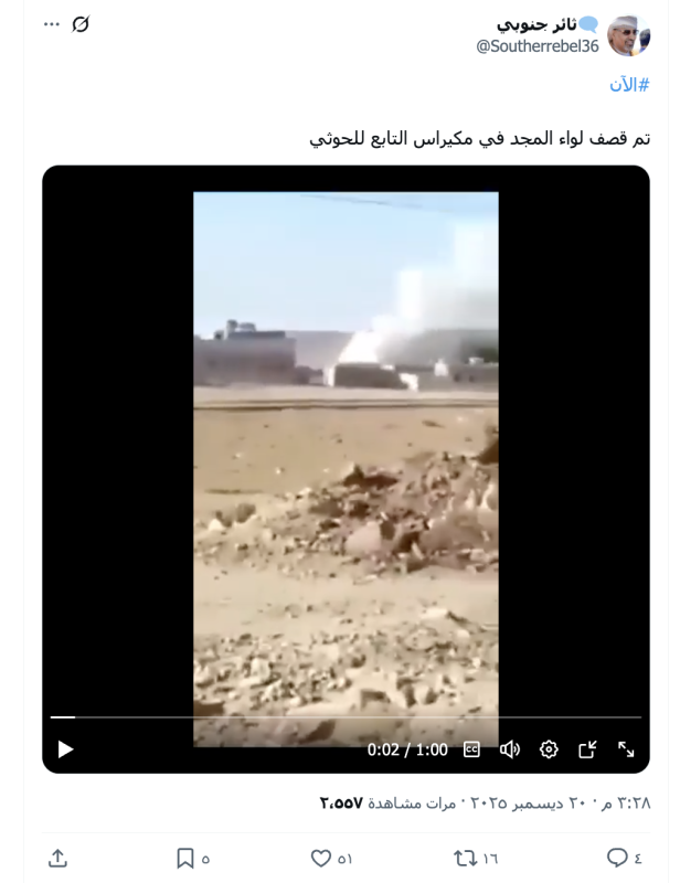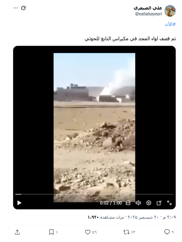 نشرت حسابات وصفحات على منصات التواصل الاجتماعي مقطع فيديو زاعمة أنه يظهر قصف حديث على لواء المجد التابع لجماعة الحوثيين في مكيراس مؤخرا