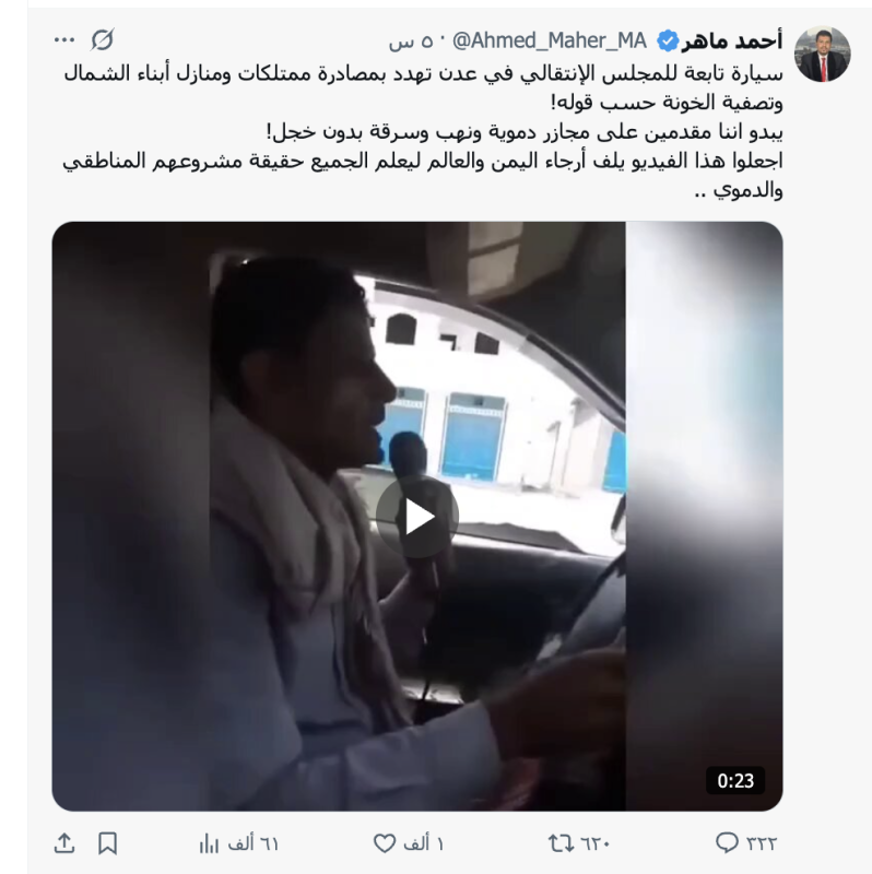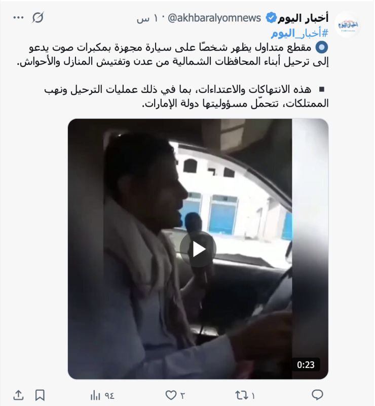 نشرت حسابات وصفحات على منصات التواصل الاجتماعي إكس وفيس بوك مقطع فيديو، مدعية أنه لسيارة تتبع الانتقالي الجنوبي في عدن تهدد بمصادرة ممتلكات ومنازل أبناء الشمال